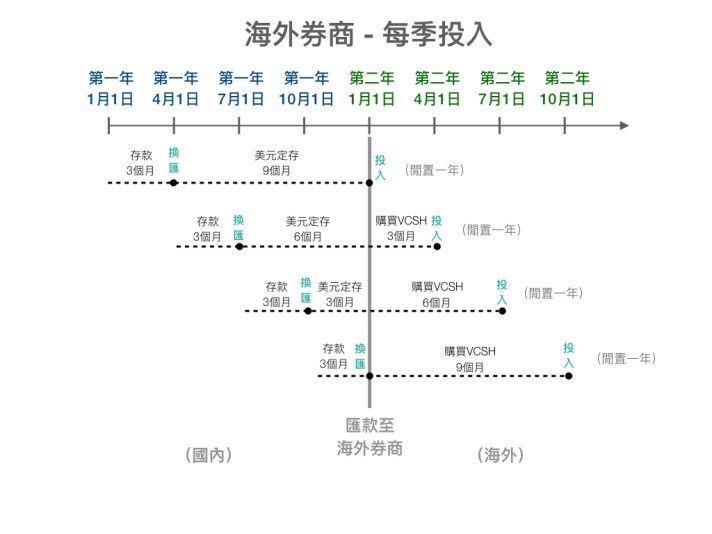 每季分別投入投資標的,在等待投入期間,使用VCSH來當作資金停泊選擇- 匯款至海外券商後,立即投入市場
