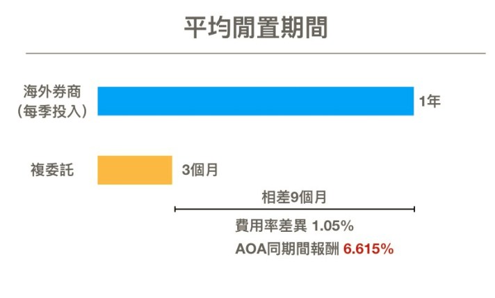 AOA年化報酬率8.82%換算成4.5個月約為3.3%(8.82*4.5/12),勝過兩者的費用率差異0.4796%,所以我們可以再次得到複委託比較划算的結論。